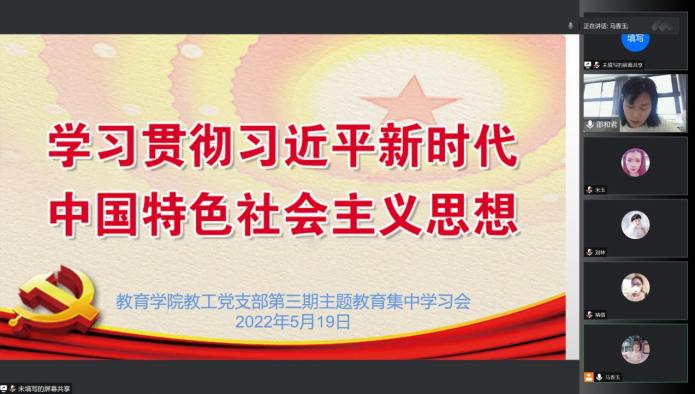 5月19日中午,williamhill英国官网教工党支部为了学习贯彻习近平新时代中国特色社会主义思想主题教育,开展第三期读书班集中学习会,本次学习会以“线上课堂”形式举行,由教工党支部委员邵和君同志主持并领学。