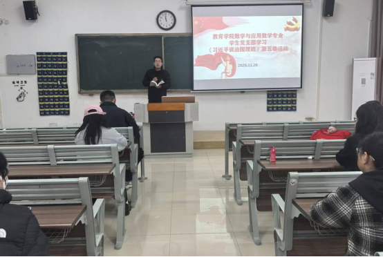 数学与应用数学专业学生党支部书记谢晨在学习会上介绍了《习近平谈治国理政》第五卷的重要地位和学习价值。他说,《习近平谈治国理政》第五卷全面系统反映习近平新时代中国特色社会主义思想最新成果,出版发行以来,在国内外引起强烈反响,高校师生中掀起学习贯彻习近平新时代中国特色社会主义思想的热潮。作为新时代的青年学生和入党积极分子,更应该认真学习研读这部著作,在学习中深刻领悟习近平总书记的治国理政智慧,增强对党的理论和路线方针政策的政治认同、思想认同、情感认同,为今后成为一名合格党员奠定坚实思想基础。