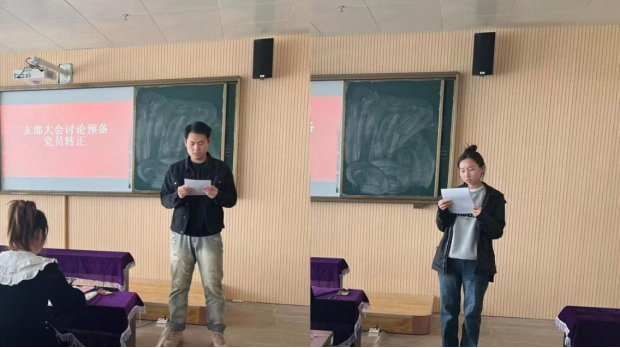 会议第二项,大会严格履行党员转正程序,由王长剑、魏美玲同志分别宣读转正申请,他们表示在预备党员期间,坚持正确的政治方向,始终在思想上与党中央保持高度一致。无论是在教学中还是在学习中,都严格要求自己,自觉遵守党的各项规章制度。