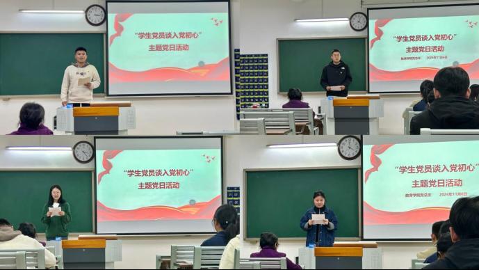 会上,27名党员同学踊跃发言,深情回忆了自己从递交入党申请书到接受组织培养、考察,被发展为中共预备党员、转为正式党员的难忘经历。大家围绕“为什么入党”、“入党做什么”等问题互相交流个人感想,分享自己的入党初心,讲述自己被吸收入党过程中的深刻记忆和难忘故事。他们讲述在党期间的成长经历,重点围绕在班级学习生活中发挥党员作用情况,对入党以来的现实表现进行自我剖析,分析了自身存在的不足,表示要进一步明确努力方向,发挥党员应有的作用。2024级汉语言文学专升本4班周春光在发言中说,自己是一名退伍军人,在部队接受了组织的培养考察,他说“我是党员我先上,我是党员跟我上”是他作为一名党员的座右铭,无论在哪里、无论在什么环境下都要牢记作为一名共产党员应当履行的义务和职责。2024级汉语言文学专升本1班吴光杰结合自己当初在专科学校担任学生干部、抗疫志愿者,积极服务师生等方面的事迹;鲍宇在发言中说“作为学生党员,要时刻以党员标准严格要求自己,在班级发挥表率作用,把学习作为一种追求,做到自觉学习、主动学习、终身学习”。其他同学在发言中也都结合自己的实际谈了入党初心,他们共同的心声就是:不忘初心,奋发向上,砥砺前行,时刻以一名党员的身份严格要求自己,牢记党员的权力和义务,全心全意为同学们服务。