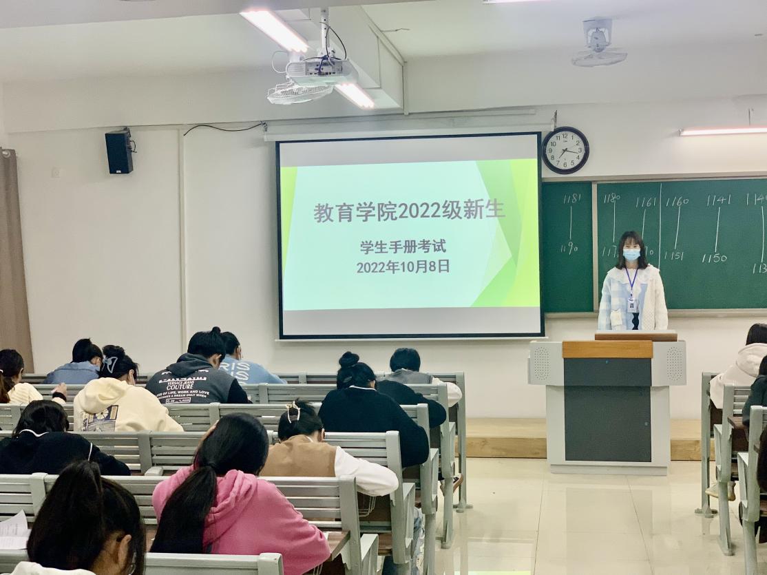 为使2022级新生尽快适应学校的教育教学和生活秩序,帮助新生知悉学校的各项规章制度,树立良好的行为规范,williamhill英国官网在组织新生学习学校各项管理规定的基础上,于2022年10月8号晚在1号教学楼开展新生《学生手册》应知应会知识点考试,全院49个新生班级近200名同学参加了考试,全体新生辅导员担任监考工作,学院分管副书记孟向红和团总支负责人黄莹莹担任巡考检查工作。