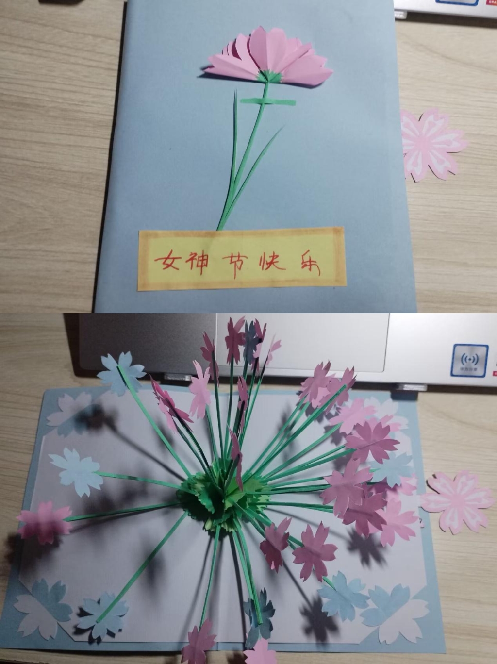 3月8日这天,同学们自发地用剪纸等艺术形式,制作一束束花卉,庆祝国际三八妇女节,在给自己和同学们带来幸福的同时,不忘向自己的母亲表达真诚的祝福和感恩,为自己心中的女神送上鲜花和礼物。