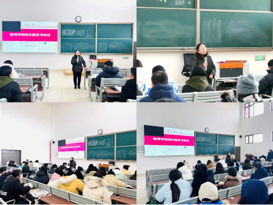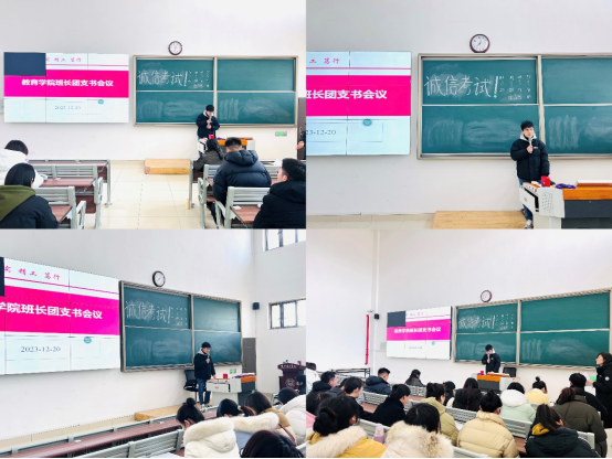 会议最后,分管副书记孟向红对会议进行总结。她说班长、团支书作为班级的主要学生干部在学院的教育教学、学生管理中发挥了很大作用,希望大家不辜负同学、老师的信任和期待,严格要求自己当好同学的表率,积极主动地履行工作职责当好桥梁和纽带。她对近期班级学生工作提出了要求,一是各班务必加强考风考纪教育,尤其是新生班级,讲清期末各类考试的规范和要求,确保不出现违纪违规现象;二是落实好学校工作要求,确保寝室安全规范用电,做好教寝室环境卫生督查工作;三是班级团支书要与思政委员一道协助辅导员做好班级政治理论学习、形势政策和主题宣讲、学生阶段性思想状况调研、文化活动、典型示范推荐等班级思想政治教育工作和安全稳定工作。