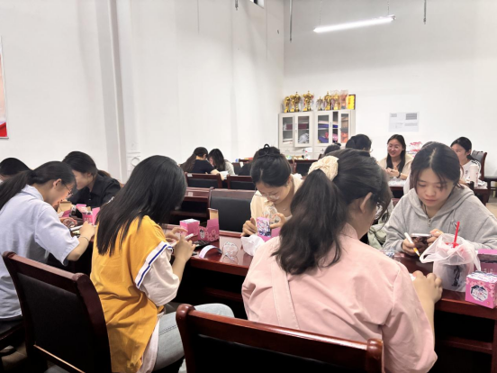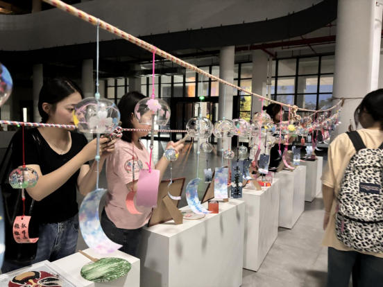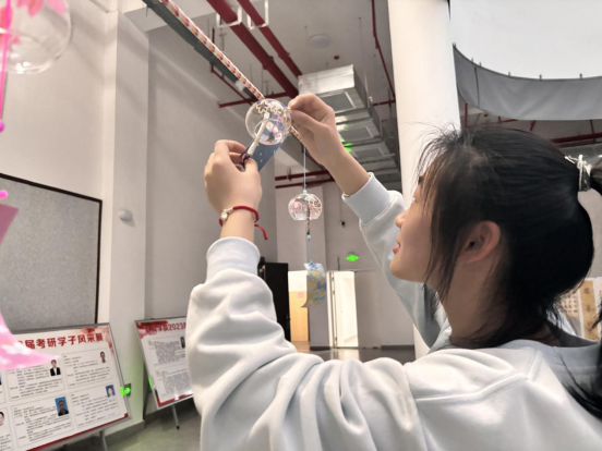 在创作过程中,同学们相互合作,友好交流,分享自己的作品。大家沉浸在轻松舒适的氛围中,用风铃实现自我表达和情感抒发,达到了心理减压的良好效果。最后,同学们将自己的作品挂在艺术楼一楼大厅进行展示。