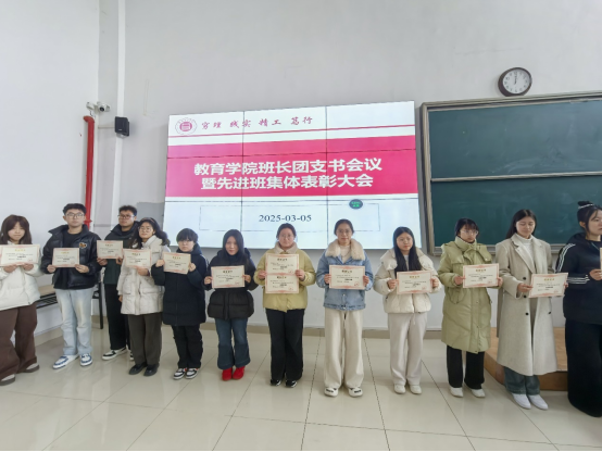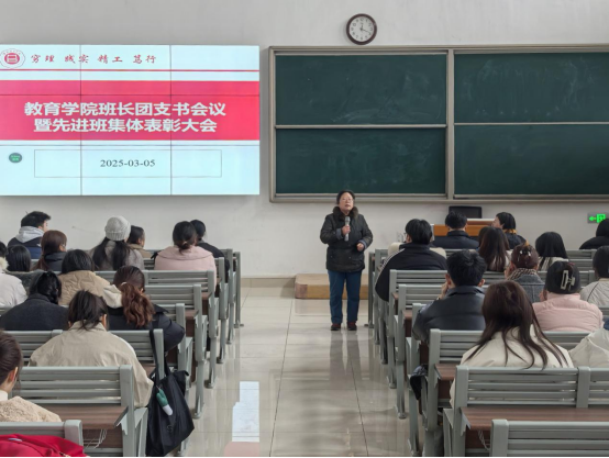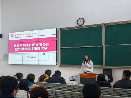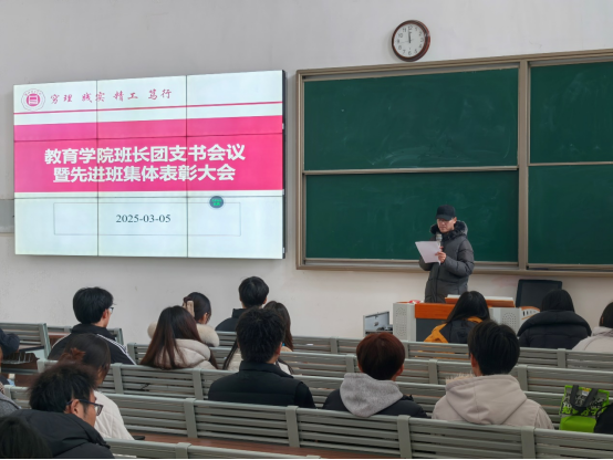 为促进班级管理交流,增强各班学生干部工作能力和激励全院班级努力营造良好班集体氛围。3月5日中午,williamhill英国官网在一号教学楼121教室开展了“班长、团支书会议暨先进班集体表彰大会”。会议由学院团总支副书记许海涛主持,分管副书记孟向红、书记助理黄莹莹、24级全体辅导员以及各班班长、团支书参加了会议。