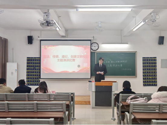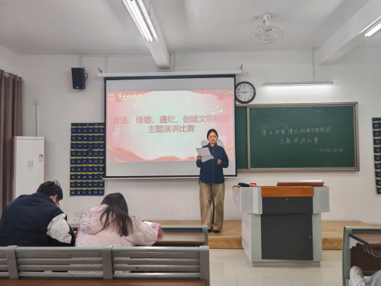 比赛现场秩序井然,选手们依次登台展现风采。他们以“普法、修德、遵纪,创建文明校园”为核心,结合校园日常与成长感悟娓娓道来,或阐述法治对青春的护航意义,或分享修德践行的细微故事,或强调纪律对校园文明的保障作用。他们语言流畅、情感真挚,时而慷慨激昂,时而温和恳切,精彩的表现多次点燃现场氛围,也让“普法、修德、遵纪”的种子在每位观众的心底悄然扎根。