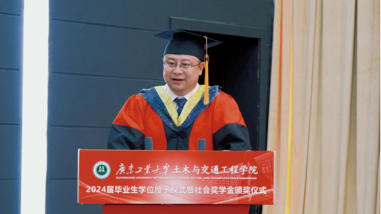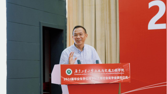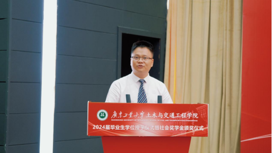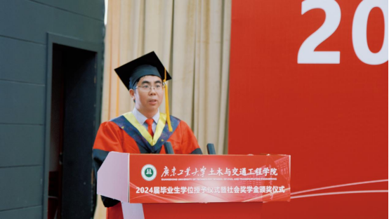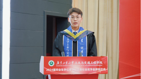 校企同心,合力育人。为了更好地发挥社会奖学金的激励和榜样作用,学院在本次仪式上集中颁发2024年“建设之星”优秀毕业生暨中山环宇“锚牌”奖学金、2023年何耀陵“锚牌”推免生奖学金、2024年中海达奖学金、2023年华创测绘奖学金、2024年 “(广工大)粤飞翔土木奖学金等五项社会奖学金。合作企业充分发挥社会责任感,助力我院育人事业蓬勃发展,校友们干霄凌云,激励了一代又一代土木学子茁壮成长。中山环宇有限公司财务总监曾镇国作为企业代表发言,他鼓励同学们饮水思源,苦练本领,寄语同学们常怀感恩之心,胸怀报国之志。