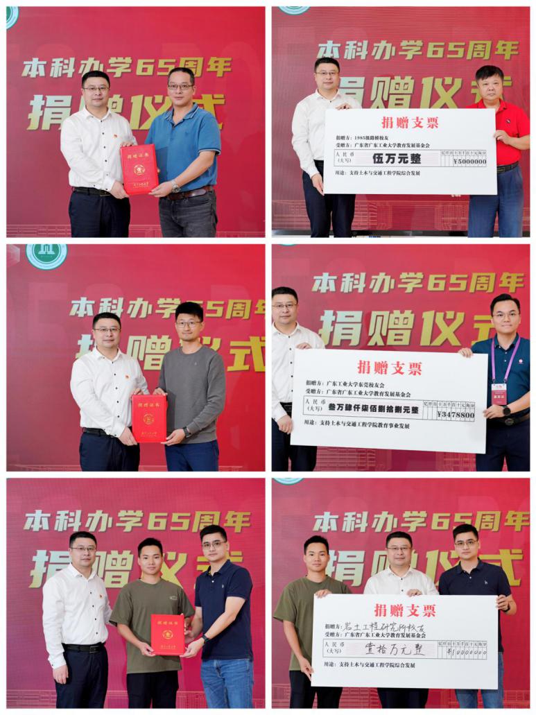 校友是母校母院综合实力的体现,是母校母院实现高质量内涵式发展的坚强支撑。10月21日,学院在中山举办的学院校友分会第二届理事会2023年会上进行了首场捐赠仪式,自年会以来,校友持续发力,倾情助力母校育人事业。校庆日当天,学院举行第二场捐赠仪式,赵志伟接受捐赠并为1985级路桥专业校友代表张汉平、1993级路桥专业校友代表陈基灿、广东度衡工程检测有限公司代表钟灿坚等9位校友代表颁发捐赠证书,感谢校友对学院事业发展的大力支持。