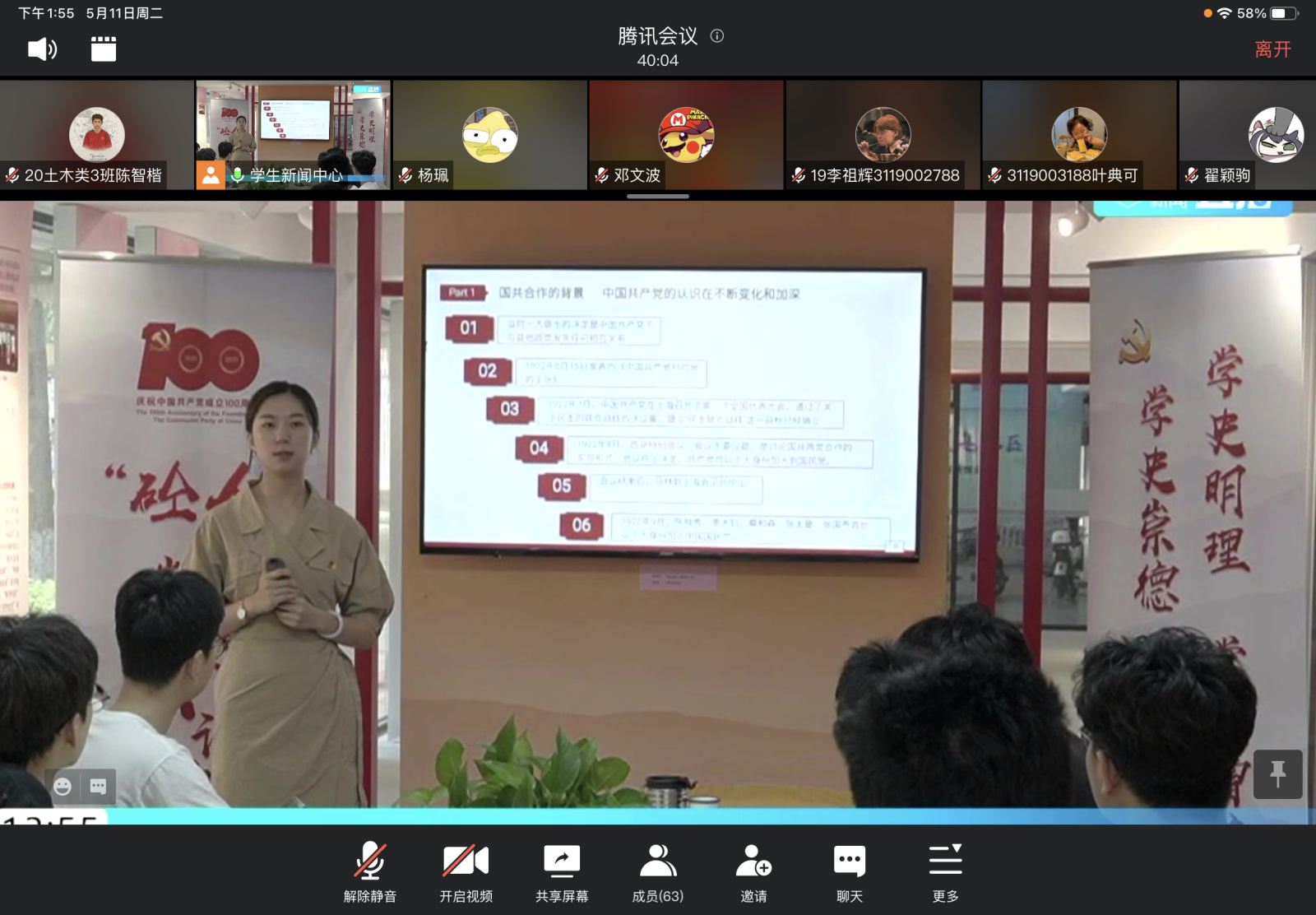 5月11日下午,我院“砼人”党史云课堂第二讲在学校党建文化园举行,本次党课的主讲人是土木工程本科生第二党支部书记刘思利,题目为《党史大革命篇:国共合作,共创大业》,支部全体党员20余人现场学习,同时通过腾讯会议平台,直播请土木工程19(4)团支部、土木类20(3)团支部近80人同步观看学习。
