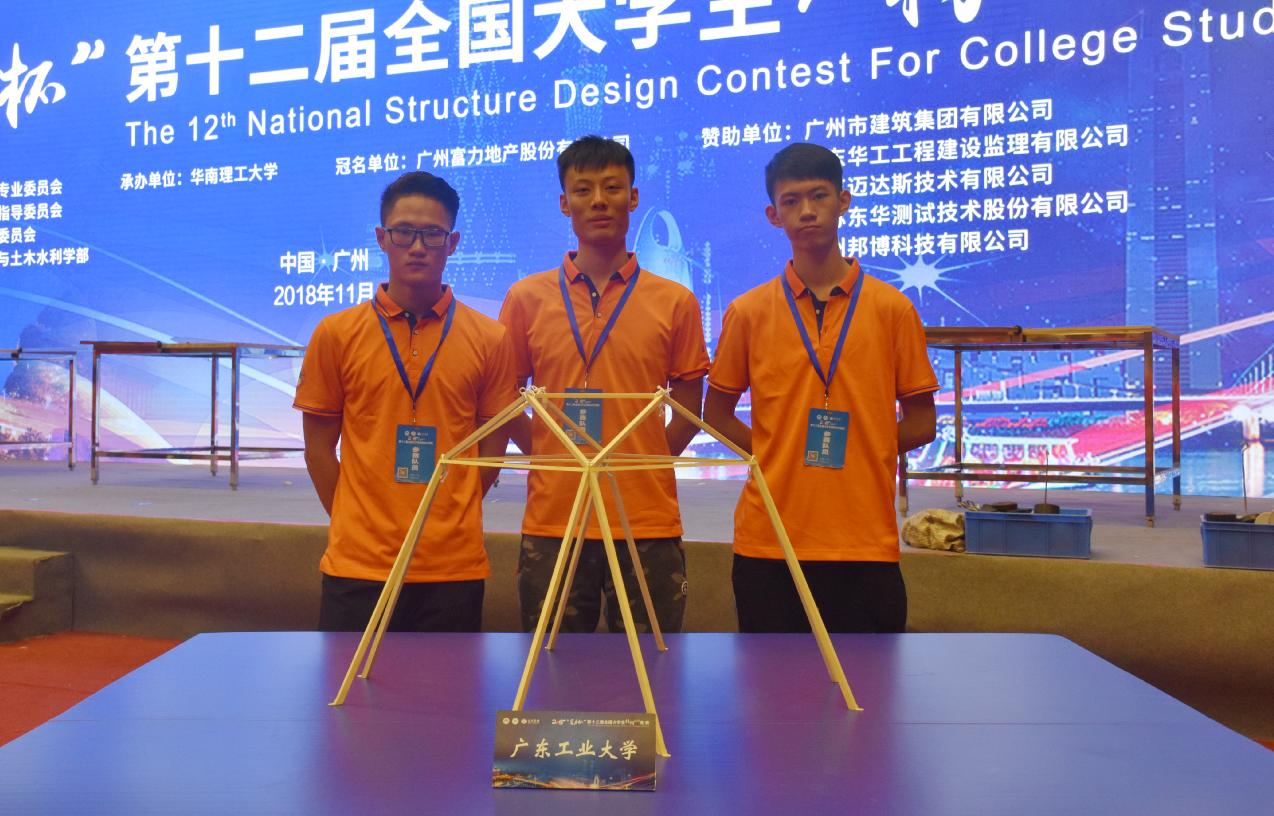 2018年11月8日至11日,“富力杯”第十二届全国大学生结构设计竞赛在华南理工大学举行。本届竞赛采取在各省(市)分区赛后选拔优秀队伍参加全国总决赛的全新组织模式,分区竞赛吸引清华大学、上海交通大学、浙江大学、同济大学等共计542所高校、1236支参赛队参与其中,参赛师生高达10000余人次,并由此产生了107所高校108支参赛队伍进入全国总决赛,是竞赛历届规模最大、参赛队伍最多的一次比赛,参赛队伍的整体实力明显上升,相比以往竞争更为激烈。我院派出1支代表队参赛。在师生的共同努力下,广东工业代表队获得全国三等奖的好成绩。