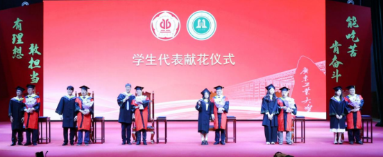 仪式核心环节,毕业生依次登台。主礼教授赵志伟、何嘉年、杨雪强、姜海波、杨晚生、张兴福郑重为其拨穗、授予学位证书并合影。毕业生代表向主礼教授敬献鲜花,表达深切感激。