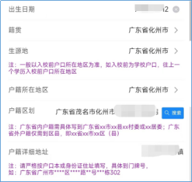 (二)补充户籍信息。请同学们在【生源地】【户籍所在地】【户籍划分】【户籍详细地址】中,严格参照备注要求规范填写相关信息。