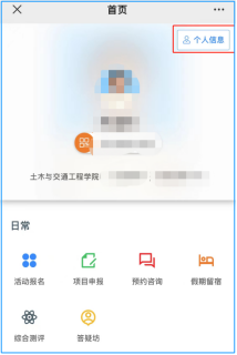 在手机微信的通讯录中,找到“广东工业大学”企业号,进入“学生工作管理”,点击菜单“学生中心”—“主界面”,点击右上角“个人信息”,进入个人信息填报界面,如下图所示。