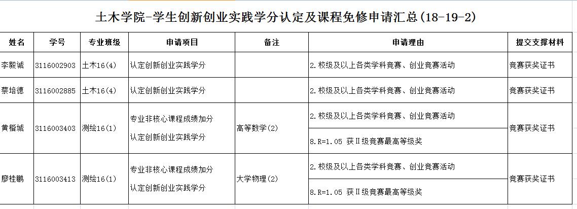 根据教务处《关于做好2018-2019学年度第二学期本科生申请创新创业实践学分认定及课程加分、免修等工作的通知》的精神,我院对照《广东工业大学创新创业实践学分认定及课程免修实施暂行办法》对学生递交的申请进行初审,现公示如下。